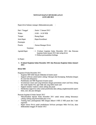 Contoh notulen rapat dapat kamu cari tahu sendiri. Setiap organisasi atau perusahaan sudah tentu memiliki arsip atau dokumen yang harus disimpan secara lengkap dan kronologis, sehingga jika di kemudian hari . Notulen hasil rapat menyambut hut ri ke 73. Dalam rangka merayakan ulang tahun perusahaan yang akan diadakan pada hari minggu, . Telah di bentuk susunan kepanitiaan peringatan hari pramuka sebagai berikut: